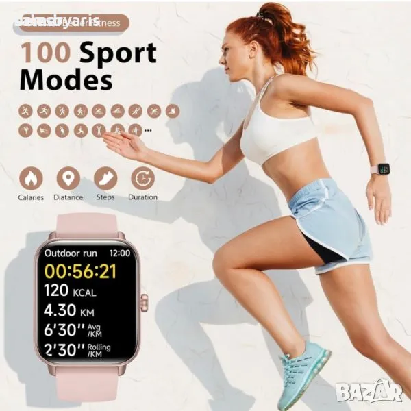 Насладете се на цялостно наблюдение на здравето с този смарт часовник, включващ усъвършенствани сензорни чипове и фотоелектрични сензори за прецизно проследяване на насищането на кръвта с кислород, сърдечната честота и налягането 24/7. Той също така предлага напомняния за менструалния цикъл за жени и автоматично наблюдение на съня с подробен анализ. Поддържайте връзка с Bluetooth разговори и вградената Alexa, което ви позволява да правите/получавате повиквания, да синхронизирате съобщения и да управлявате своя смарт часовник с гласови команди. Насладете се на жив 1,8-инчов HD сензорен екран и персонализирайте изживяването си с до 100 циферблата и персонализирани фото циферблати. С IP68 водоустойчив рейтинг и поддръжка за 100 спортни режима, включително плуване, този смарт часовник е идеален за фитнес ентусиасти. Освен това се насладете на многофункционални функции като управление на камерата, прогноза за времето, управление на музика и други, всички с дълъг живот на батерията до 7 дни. Съвместим с Android 6.0 и iOS 9.0 или по-нови смартфони.