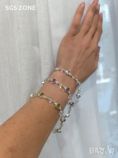 Сребърна гривна с естествени камъни от Тайланд с нешлифован прозрачен топаз и син топаз, с аметист и перидот. Още снимки и видеа на продукта в Instagram и Facebook sgs.zone, уебсайт sgs.zone. Изпращане Speedy и Эконт. Шоурум в София, Дондуков, 53. Всички продукти са със сертификати и подаръчна кутия