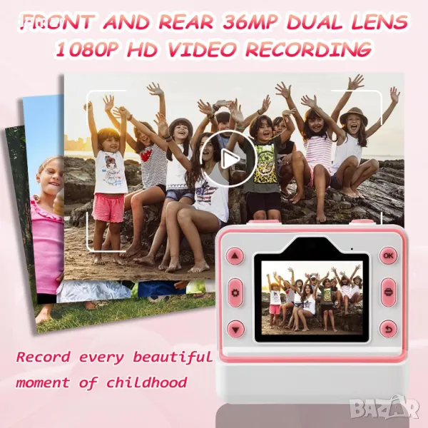 Камерата има предна и задна 36MP двойна леща, поддържа 1080P HD видео запис и селфита. 2.4-инчовият IPS екран осигурява ярки цветове и различни функции като 10x zoom, светкавица, забавен кадър, непрекъснато снимане и музика.