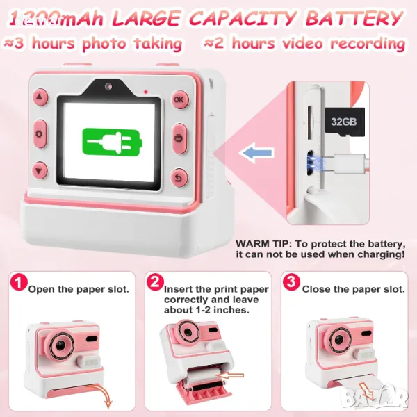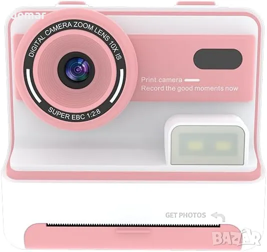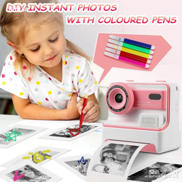 Камерата използва безмастилна термична технология за печат, като просто натискате бутона за печат и получавате черно-бели снимки за секунди. Включени са цветни маркери за персонализиране на снимките, позволявайки на децата да развиват своето въображение.