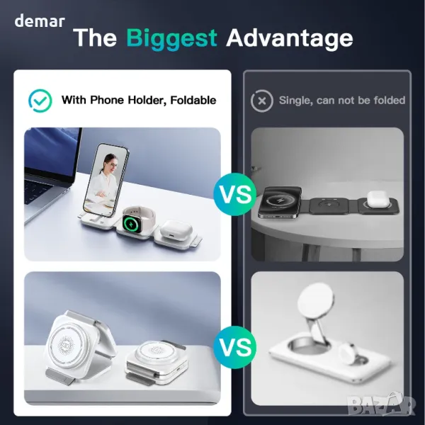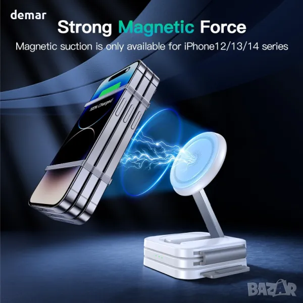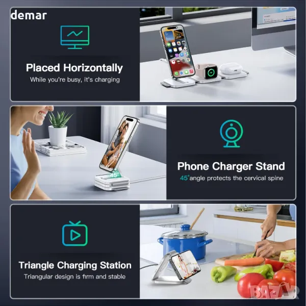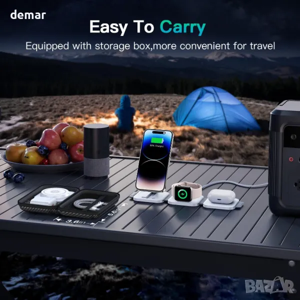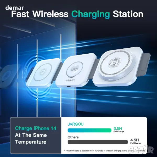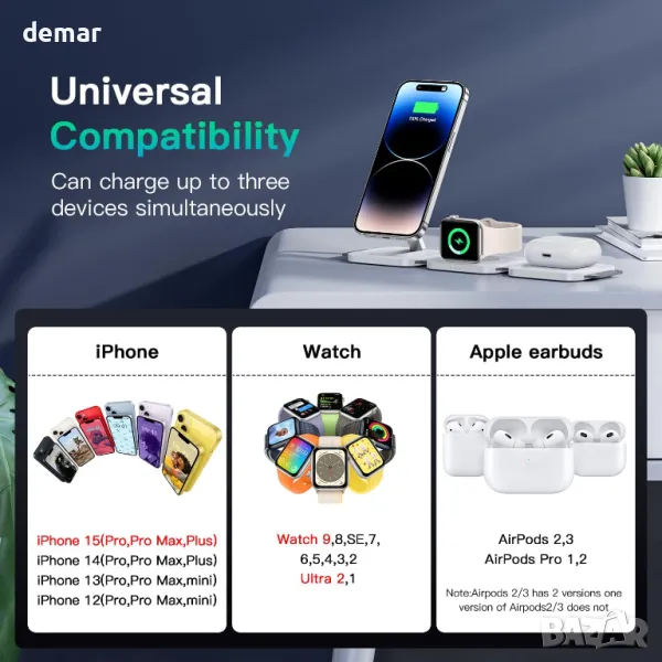 JARGOU 3 в 1 Магнитен безжичен заряден уред ви позволява да зареждате три устройства едновременно — iPhone, Apple Watch и AirPods — което значително увеличава ефективността на зареждането. Оснащен с магнитна адсорбционна технология, осигурява стабилно и правилно зареждане, предотвратявайки подхлъзване или премествање на устройствата. Сгъваемият и преносим дизайн го прави идеален за пътувания, лесно се побира в чанта или раница за зареждане в движение. Зарядното устройство също така служи като магнитна стойка за iPhone, позволявайки ви да гледате видеа и зареждате устройството едновременно. Вградените системи за безопасност (предпазване от презареждане, прегряване и късо съединение) осигуряват безопасността на устройството и удължават неговия живот. Съвместим с iPhone 15/14/13/12 серия, Apple Watch 9/Ultra 2/8/7/6/SE/5/4 и AirPods 2/3/Pro, също така е съвместим с повечето калъфи за телефони, включително магнитни и силиконови калъфи. (Забележка: Не е съвместим със Samsung Watch или някои зарядни калъфи за AirPods.)