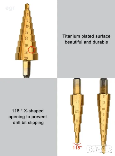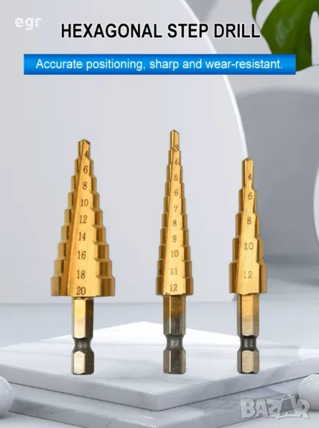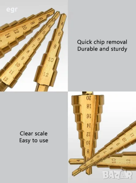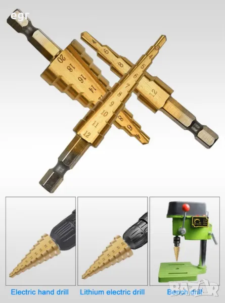 Стъпаловидни конусни титаниеви свредла комплект, снимка 1 - Други инструменти - 49847130 Стъпаловидни конусни титаниеви свредла комплект, снимка 2 - Други инструменти - 49847130 Стъпаловидни конусни титаниеви свредла комплект, снимка 3 - Други инструменти - 49847130 Стъпаловидни конусни титаниеви свредла комплект, снимка 4 - Други инструменти - 49847130 Стъпаловидни конусни титаниеви свредла комплект, снимка 5 - Други инструменти - 49847130 Стъпаловидни конусни титаниеви свредла комплект, снимка 6 - Други инструменти - 49847130 1/6