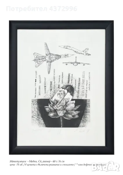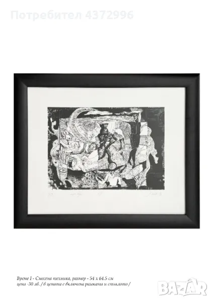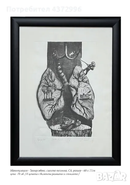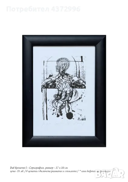 Продавам оригинални печатни графики, сериграфии и дигитални печати. В цената на произведенията се включват рамката и стъклото. Рамката е от дървен профил / на снимките не се вижда добре, но при интерес, мога да изпратя снимка в близък план на профила /. При желание, мога да изпратя и само отпечатък на по-ниска цена. Цените варират между 30лв. - 70лв. в зависимост от техниката и творбата, всяка цена е обозначена на снимките. От български автор.