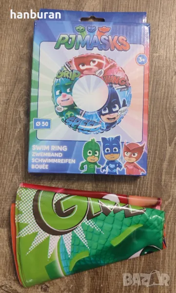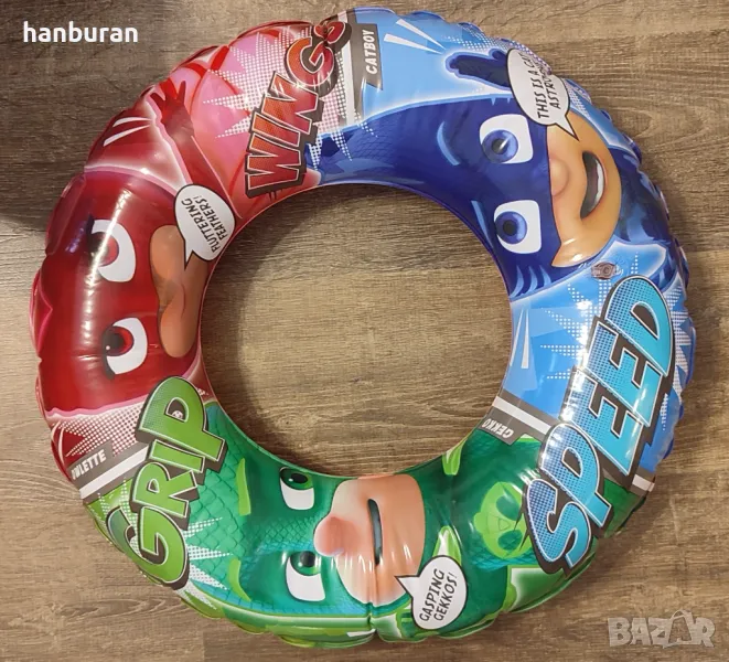 Два детски надуваеми пояса. Диаметър и на двата пояса е 50см. Подходящи са за деца от 3 до 6 години. Пояс MONDO PJ MASKS има и кутия. Без забележки. Цена за двата е 7лв.