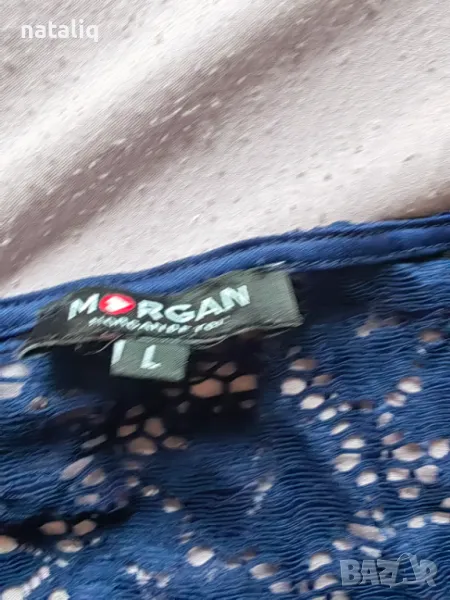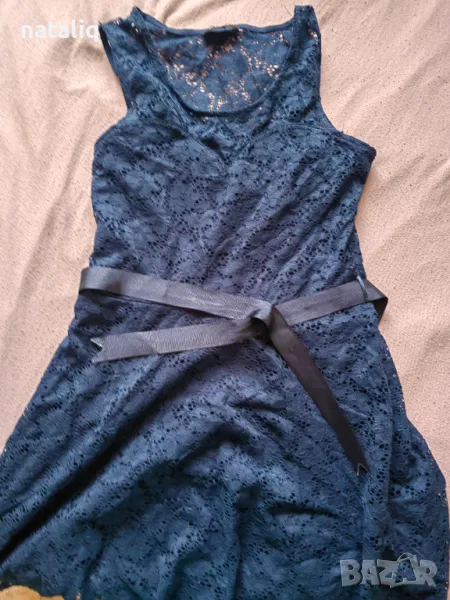 Дамска официална рокля със синя дантела и сатенено коланче.подходящо за празници.Стои много добре.Размер л