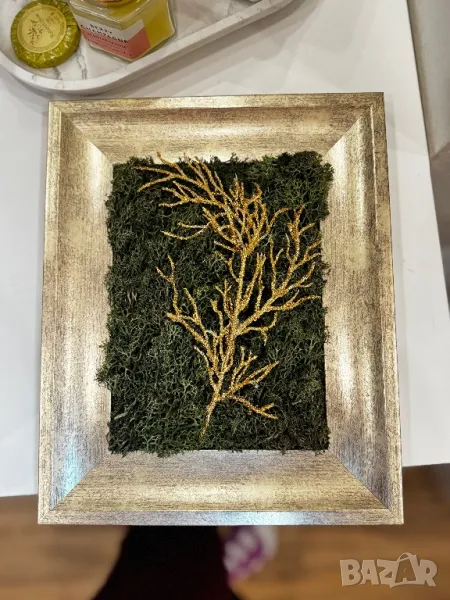 Пленителна и изискана, тази ръчно изработена мъхова картина носи усещане за спокойствие и елегантност. Съчетанието между наситено зелен стабилизиран мъх и златиста декоративна клонка с брокат придава фин блясък и празничен акцент, без да е натрапчиво.