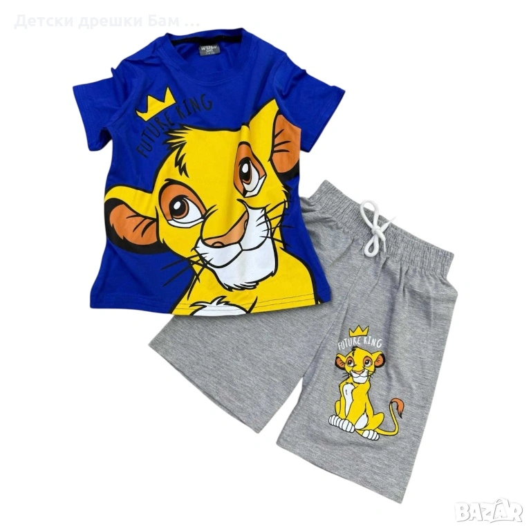 Синята тениска с ярък принт на лъвчето и надпис „Future King“ се комбинира идеално със сивите панталонки с еластична талия и геройско настроение.