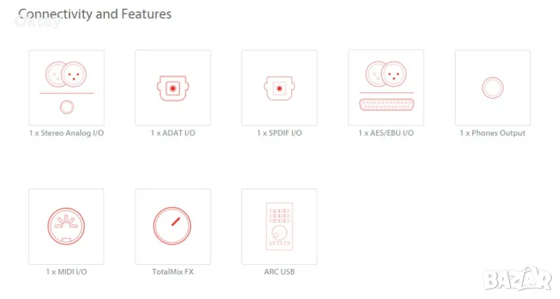 В комплект с USB Volume Control Knob за управление на изходното ниво и брейкаут кабел BO9632CMKH с небалансирани изходи - един стерео изход на чинчове, един стерео вход на чинчове, един изход за слушалки 6.3мм и MIDI.