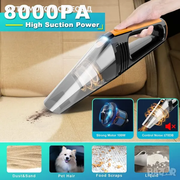 Прахосмукачката за кола използва 100W/12V мотор с висока мощност със силна смукателна мощност до 8000PA, шумът се контролира под 70DB, може да се използва както мокро, така и сухо.