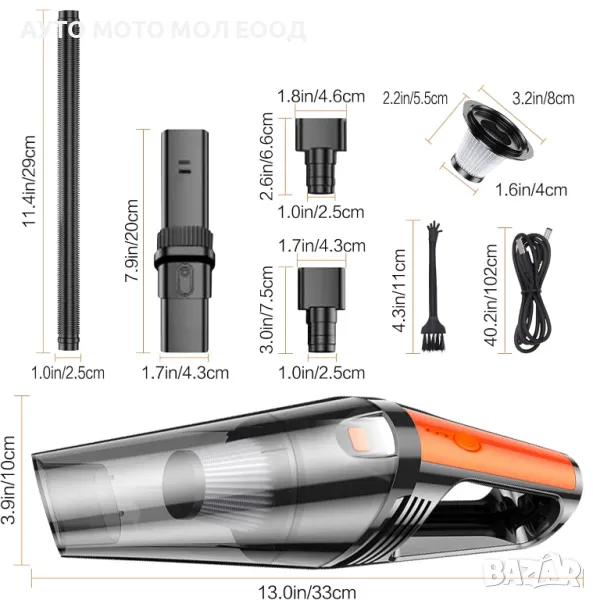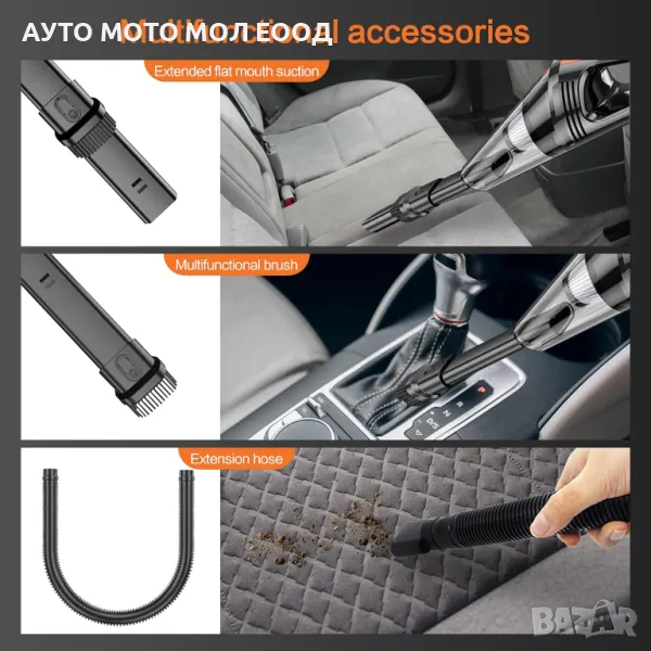 Преносимата прахосмукачка 100w/12V за кола Aetrius е оборудвана с накрайник и четка, удължен маркуч, малка четка, миещ се филтър, който може да отговори на нуждите от високоефективно засмукване и дълбоко почистване в различни зони, дори ъгли и празнини.