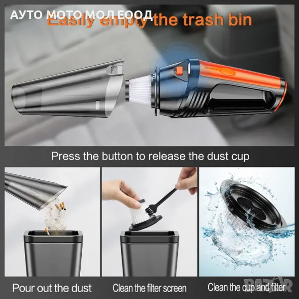 Прахосмукачката за кола може лесно да абсорбира прах, косми от домашни любимци, пясък, чакъл, остатъци от храна и вода.