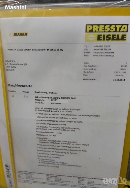 Автоматична ъглонабивна машина Pressta Eisele, снимка 1 - Други машини и части - 49853570 Автоматична ъглонабивна машина Pressta Eisele, снимка 2 - Други машини и части - 49853570 Автоматична ъглонабивна машина Pressta Eisele, снимка 3 - Други машини и части - 49853570 Автоматична ъглонабивна машина Pressta Eisele, снимка 4 - Други машини и части - 49853570 Автоматична ъглонабивна машина Pressta Eisele, снимка 5 - Други машини и части - 49853570 Автоматична ъглонабивна машина Pressta Eisele, снимка 6 - Други машини и части - 49853570 Автоматична ъглонабивна машина Pressta Eisele, снимка 7 - Други машини и части - 49853570 Автоматична ъглонабивна машина Pressta Eisele, снимка 8 - Други машини и части - 49853570 Автоматична ъглонабивна машина Pressta Eisele, снимка 9 - Други машини и части - 49853570 Автоматична ъглонабивна машина Pressta Eisele, снимка 10 - Други машини и части - 49853570 1/10