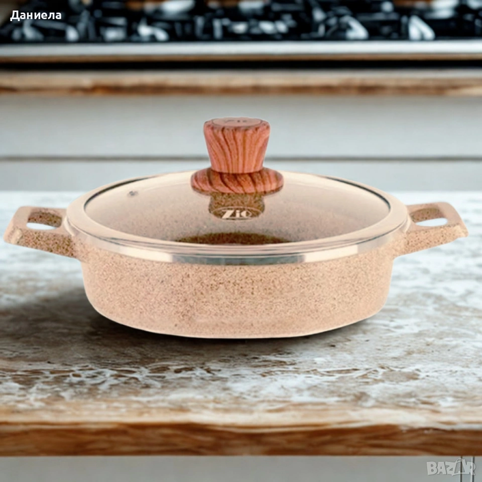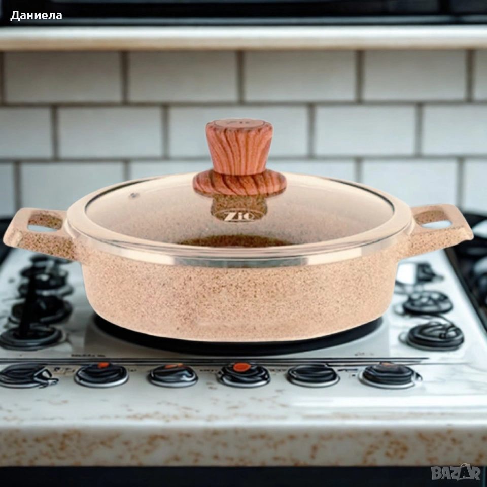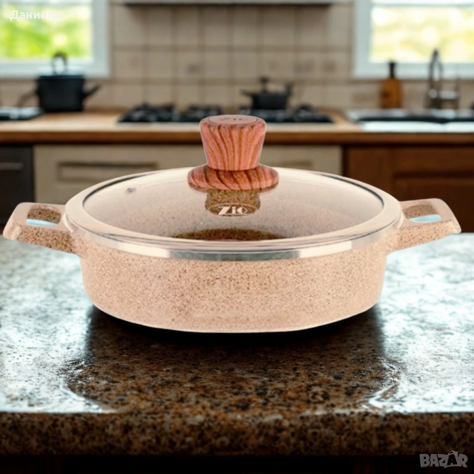 Марка: Lexical;Серия: ECO SMART;Тип: Ниска касерола с капак;Размер: 44 см;Вместимост: 2 литра;Материал на тялото: Лят алуминий (Die-Cast Aluminium);Покритие: Гранитно, незалепващо;Капак: Стъклен, с ергономична дръжка;Дъно: Индукционно – подходящо за всички видове котлони;Устойчивост: На високи температури и надрасквания;Лесна поддръжка: Подходяща за съдомиялна машина.