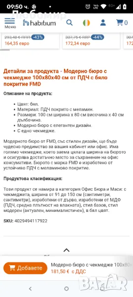 с транспортен дефект на места.Модерното бюро от FMD, със стилен дизайн, ще бъде чудесно предимство за вашия кабинет или офис. Има голямо чекмедже, което заема цялата ширина на бюрото и осигурява достатъчно място за съхранение на офис консумативи. Бюрото с марка FMD е изработено от устойчиво ПДЧ с меламиново покритие.