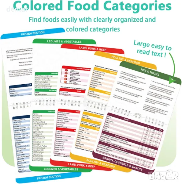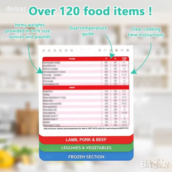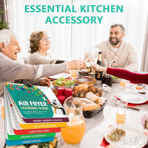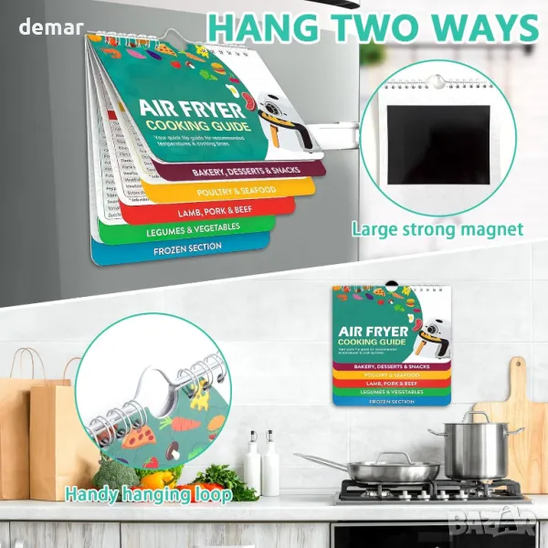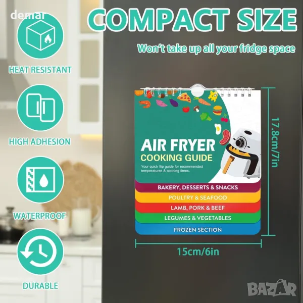 Това изчерпателно ръководство за фритюрник предлага настройки за готвене за различни храни, осигурявайки лесен достъп до идеалното време за готвене без търсене в интернет. Със силна магнитна подложка, той надеждно се закрепва към всяка магнитна повърхност. Ръководството разполага с големи, лесни за четене шрифтове и включва преобразуване на Фаренхайт и Целзий, заедно със съвети и трикове за готвене. От овладяване на хрупкави резултати до разбиране на подходящи теста, този аксесоар е от съществено значение за подобряване на вашите умения за пържене на въздух.