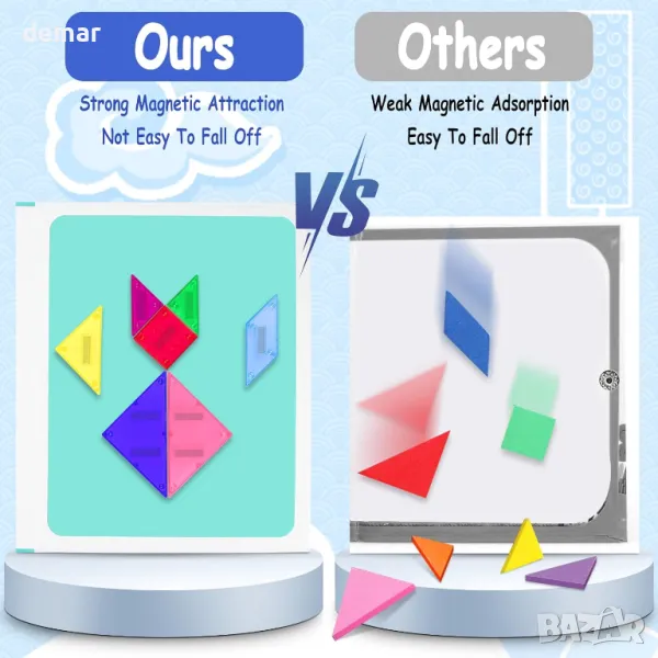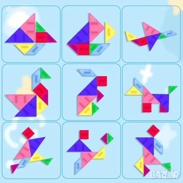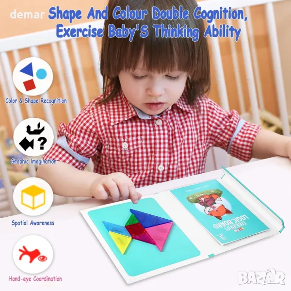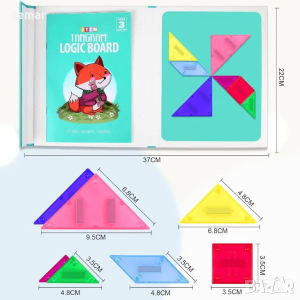 Този комплект магнитни пъзели Tangram за деца с размери 8,8 x 7,3 x 0,6 инча е идеален за забавление на децата по време на пътуване. Включва седем цветни магнитни фигури за формиране на различни модели, подходящи за възраст от 4 до 12 години, предлагащи образователни забавления и предизвикателства за трениране на мозъка. Изработен от безопасен ABS материал със силни магнити и гладки ръбове, той осигурява безопасност и удобство. Комплектът насърчава креативността с 96 модела за създаване на различни форми и фигури, засилвайки детското търпение, наблюдателност, практически умения и координация око-ръка.