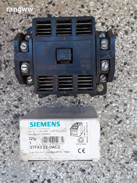 Контактор SIEMENS Тип:3TF4322-0AC2 Контакти: 2S+2O/2NO+2NC AC3 - 30А 400V АС Бобина: Us AC 24V 50/60Hz 18 евро за 1 бр. Контактор + К4-II ; 63А ; 600 волта; Бобина: AC 24V 50/60Hz-35 евро./бр.