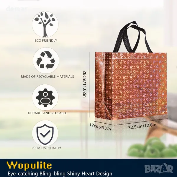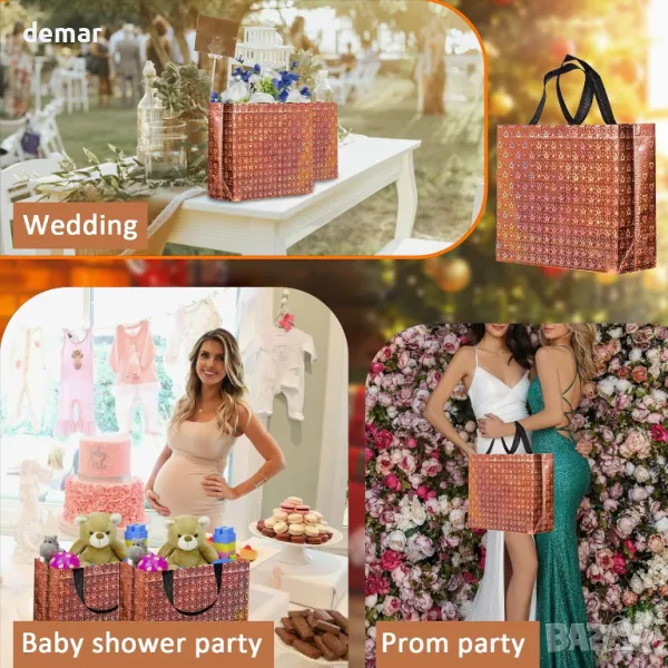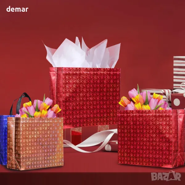 Тези подаръчни торбички са идеални за опаковане подаръци, идеални за партита, играчки и празнични поводи като Свети Валентин , 8ми Март. Коледа и др. празници. Чантите са с размери 32*17*25,5 см, предлагащи достатъчно място за бонбони, шоколади, играчки или дори кутии за обувки, с живи цветове и празничен дизайн, които се открояват. Комплектът включва 12 големи чанти с 3 различни дизайна.