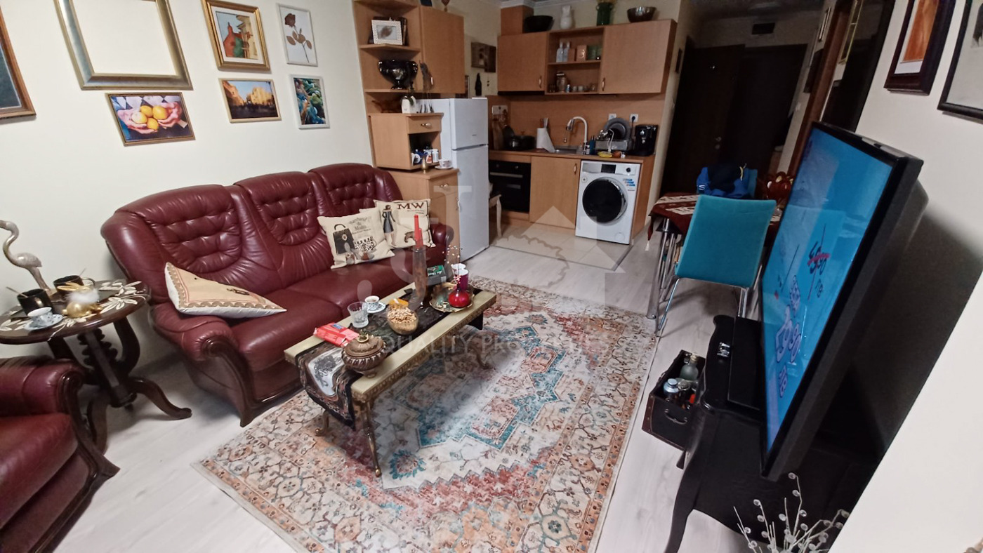 Апартаментът се намира на 4-ти етаж, с обитаема площ от 50 кв.м и е със следното разпределение: входно антре, дневна с трапезарна част и кухня с всички необходими ел.уреди, спалня, баня с тоалетна и тераса. Отоплението и охлаждането е на климатици. Такса поддръжка към комплекса 4 евро на кв.м.