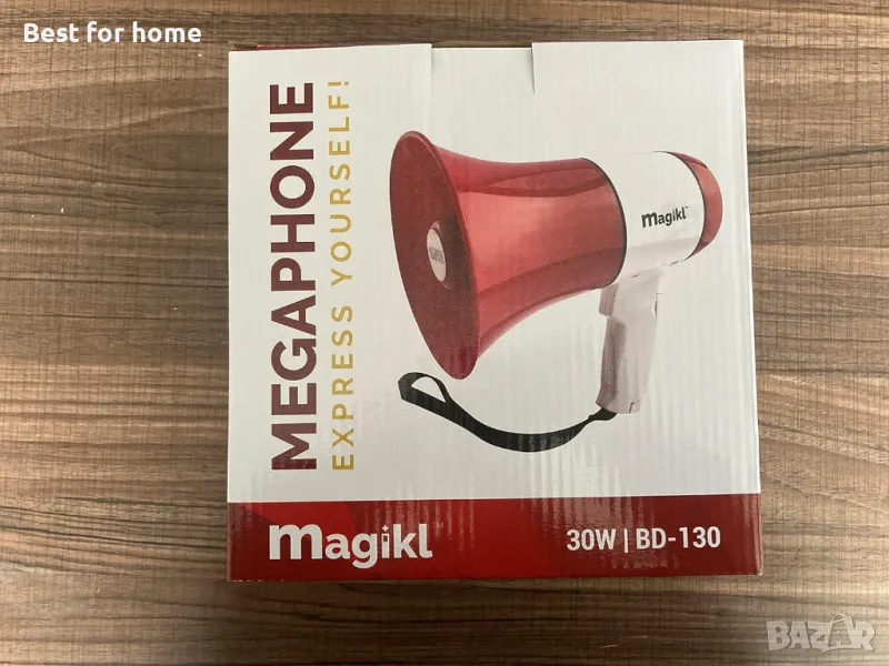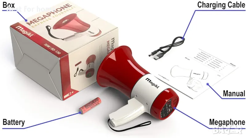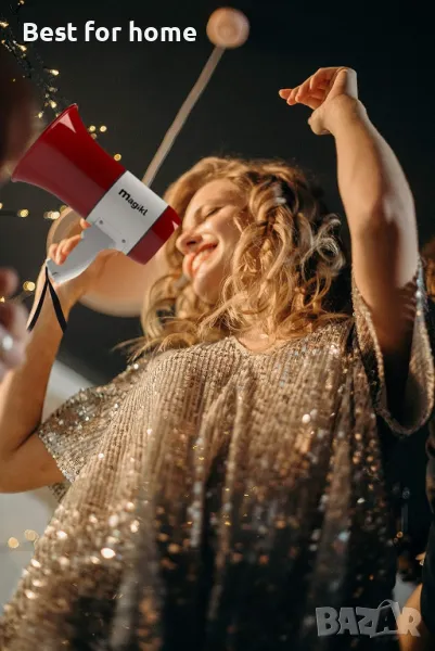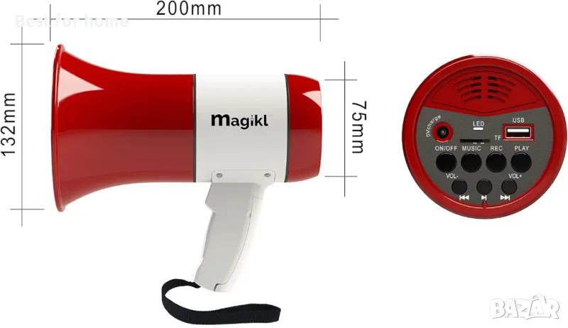 Мегафонен високоговорител Magikl със сирена - Преносим силен звук - MP3 плейър и функция за запис, включени акумулаторна батерия и USB кабел за зареждане - За партита, спортни събития и професионална употреба
