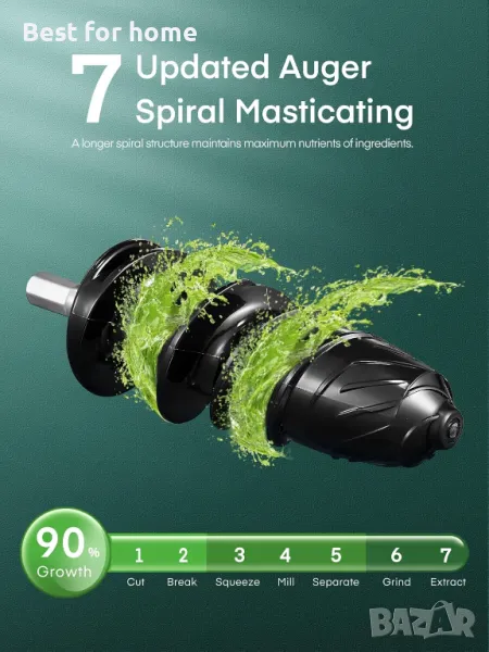 Спирална система за дъвчене-Модернизираната 7-сегментна спирална система за дъвчене на бавната сокоизстисквачка осигурява максимално извличане на сок и отделяне на пулпа, което води до по-висок добив на сок, обогатен с аромат, естествен вкус и хранителни вещества като витамини и минерали. Процесът е ефективен, тих и прост, което го прави идеално допълнение към всяка кухня.