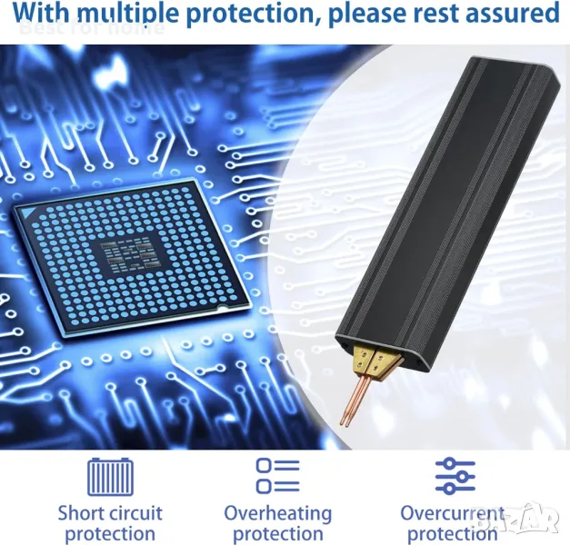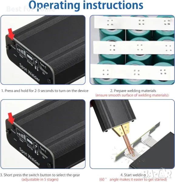 зареден, способен на непрекъснато заваряване 1000 пъти Пет регулируеми нива на мощност, кратко натискане на бутон за управление, синя светлинна индикация Порт за зареждане: USB щепсел за зареждане Напрежение за зареждане: 5 V вход (вход с по-високо напрежение е строго забранен) Заряден ток: 1 A (препоръчително е да използвате зарядно устройство 5 V/2 A) Този продукт поддържа зареждане, докато се използва. Индикаторът за оставащ заряд на батерията е зелен (висок), зелен мигащ (среден висок), червен мигащ (среден нисък), червен (нисък). Червената лампичка свети и трябва да се зареди преди да работи. Ниското ниво на батерията ще повлияе на ефекта на заваряване Инструкции за включване/изключване: Кратко натискане за включване Продължително натискане за изключване 6 минути без никакво действие автоматично ще изключи Инструкции: 1. Натиснете кратко бутона за включване, натиснете дълго бутона за 3 секунди за изключване 2. След стартиране модулът е в автоматичен режим на заваряване и заваряването се извършва веднъж на всеки 2 секунди 3. След включване изходната мощност на машината за точково заваряване може да се промени чрез кратко натискане на бутона и синята светлина показва позицията на предавката 4. Уверете се, че заваръчната повърхност на батерията е без ръжда и чиста и равна