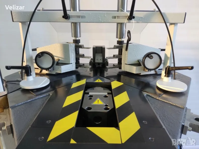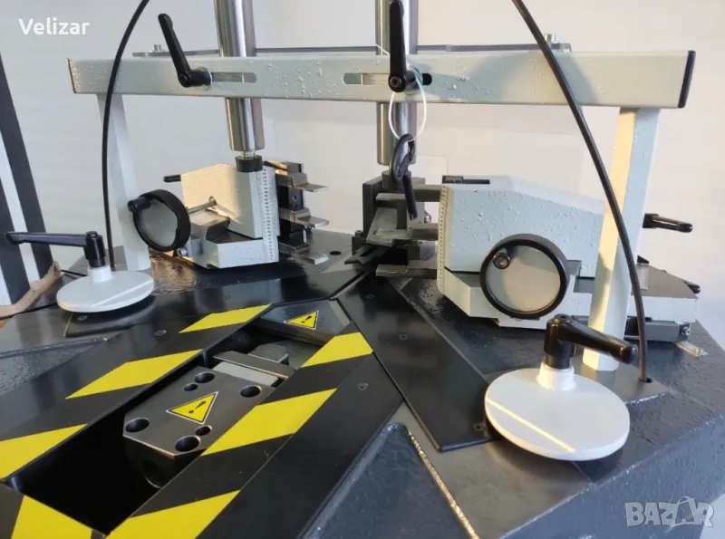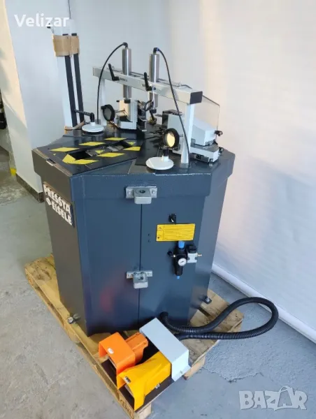 Автоматична ъглонабивна машина Pressta Eisele 2000 - Германия с двойна регулируема глава за бърза и прецизна настройка към всички системи каси и крила с едни и същи ножове, не е необходимо да се изработват различни видове ножове за различните системи. Машината работи само с един комплект ножове, без смяна може да обработва всички системи каси и крила.
