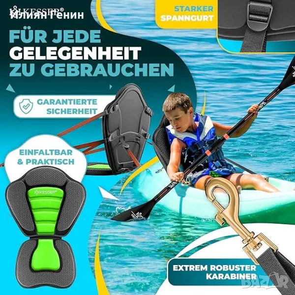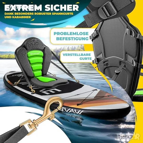 каяк! Удобната седалка за каяк се монтира бързо и лесно. Благодарение на интелигентния монтаж с регулируеми презрамки, седалката винаги има сигурна фиксация и пасва на всички SUP дъски, каяци и канута, включително SUP от KESSER.