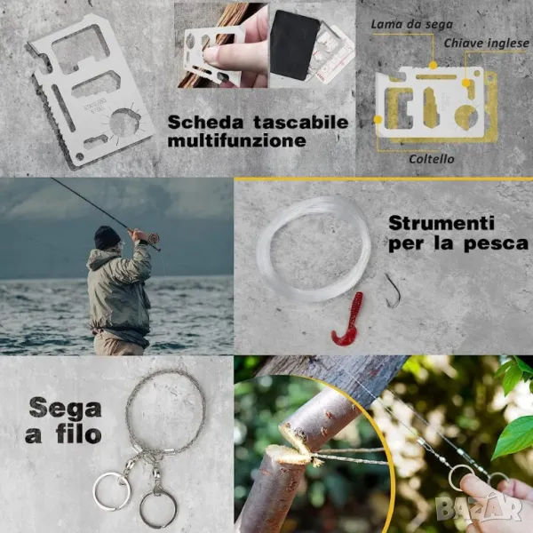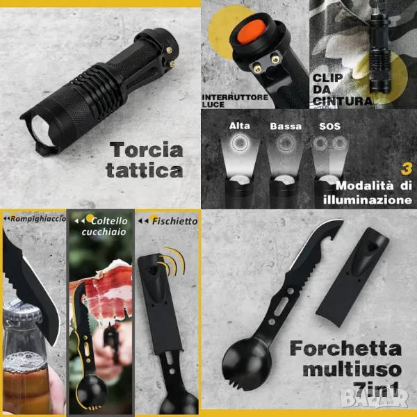 Комплектът за оцеляване е идеален за любителите на туризма, къмпинга и други активности на открито. Включва различни инструменти и принадлежности, които ще ви помогнат да се справите с различни ситуации в природата. Този комплект за оцеляване е идеален за къмпинг, туризъм, приключения, оцеляване и спешни случаи. Комплектът тактическо оборудване за оцеляване е лек и компактен за удобен транспорт и съхранение. Наборът от професионални тактически инструменти за оцеляване може лесно да бъде поставен в раница, кола, чекмедже, джоб или чанта.