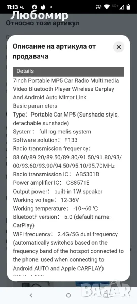 WiFi честота: 2.4G/5G двучестотна (автоматично превключва въз основа на честотната лента на свързаната с телефона точка за достъп, използвана при свързване към Android AUTO и Apple CARPLAY). TYPE-C интерфейс: USB 2.0 Read (само за CARPLAY).