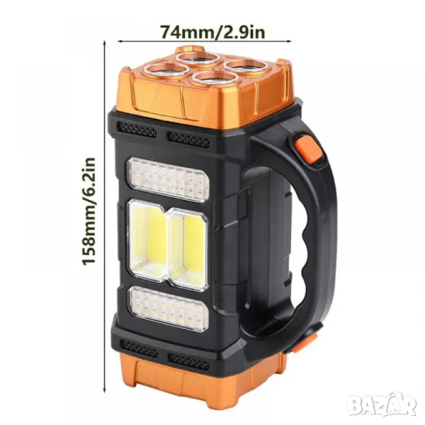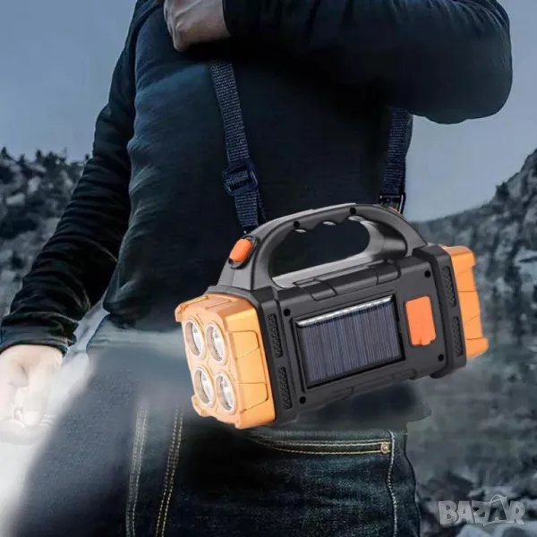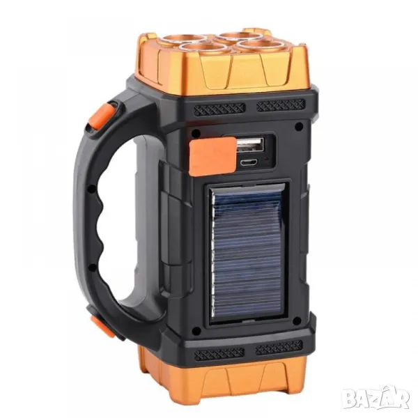 Супер мощен къмпинг фенер с насочена светлина - оранжева/бяла светлина и странична светлина-тип настолна лампа.Подходящ за охрана на обекти, или за къмпинг излети. Зареждането на фенера е чрез USB кабел от комплекта, и също така със соларно зареждане.