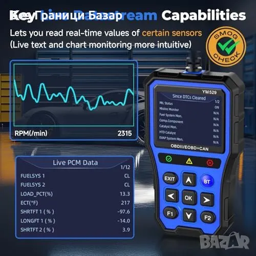 Чете и изчиства грешки, проверява I/M статус, EVAP тестове, VIN разпознаване
