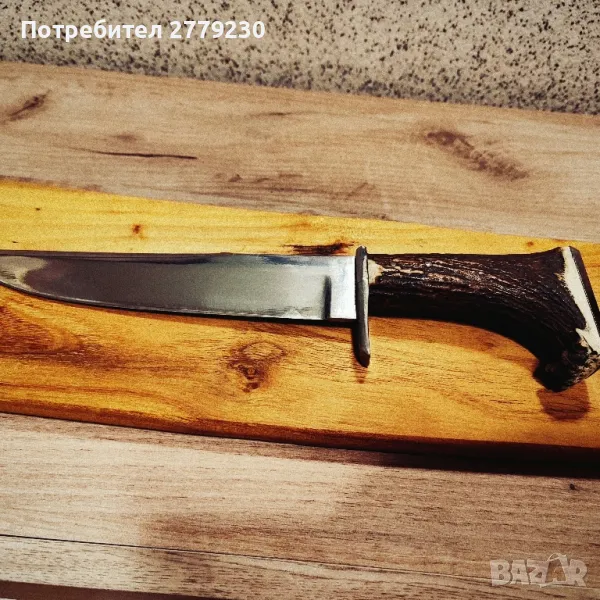 Много масивен ловен нож ръчна изработка изработка а дръжка от еленов рог.Обща дължина на ножа 33 см, дължина на острието 20 см. Колекционерски! При интерес обаждане или съобщение. Вижте и другите обяви на уникални ножове !