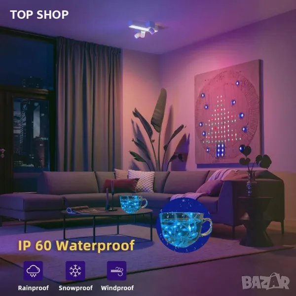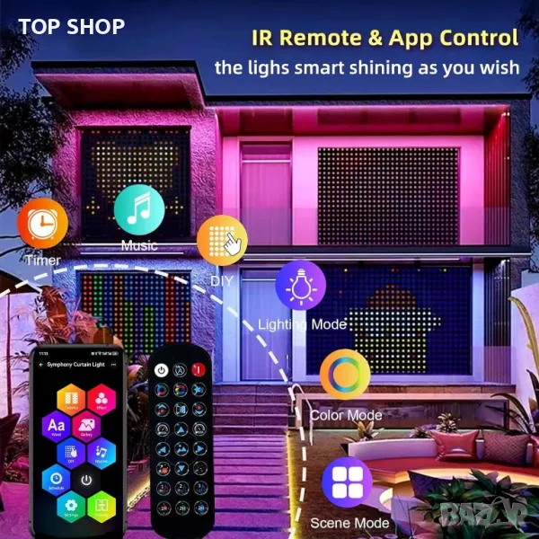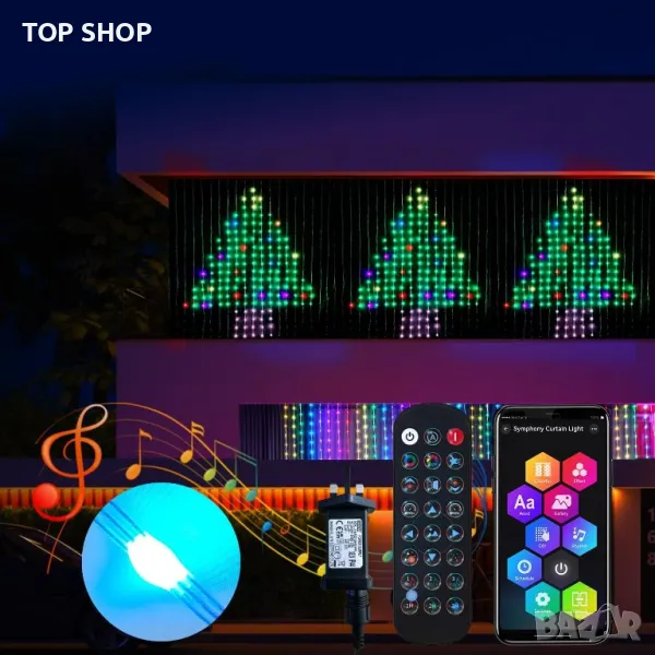1x1m светлини-завеса, включващи вградени независими контролни чипове за динамични цветни дисплеи и сценични режими, наподобяващи дъга. С динамична и статична технология за управление, таймер и режим на свързване, можете без усилие да управлявате до 5 комплекта едновременно за вашия мечтан дом. Насладете се на дистанционно управление чрез нашето интуитивно приложение, предлагащо персонализиране на 16 милиона цвята, яркост и скорост, заедно със 17 различни светлинни ефекта. Вграденият микрофон с висока чувствителност синхронизира светлините с музиката, създавайки потапящо изживяване, което танцува в ритъма. Бъдете креативни с опциите „Направи си сам“, изработвайки уникални шрифтове, картини и цветове, които да отговарят на вашето въображение. С водоустойчива функция IP65 за кабела със светеща нишка, тези завеси са идеални за употреба на закрито и на открито, добавяйки чар към поводи като Свети Патрик, Свети Валентин, Хелоуин и др. Идеални за прозорци, спални, партита, градини и тържества, тези светлини-завеси внасят магия във всяка обстановка.