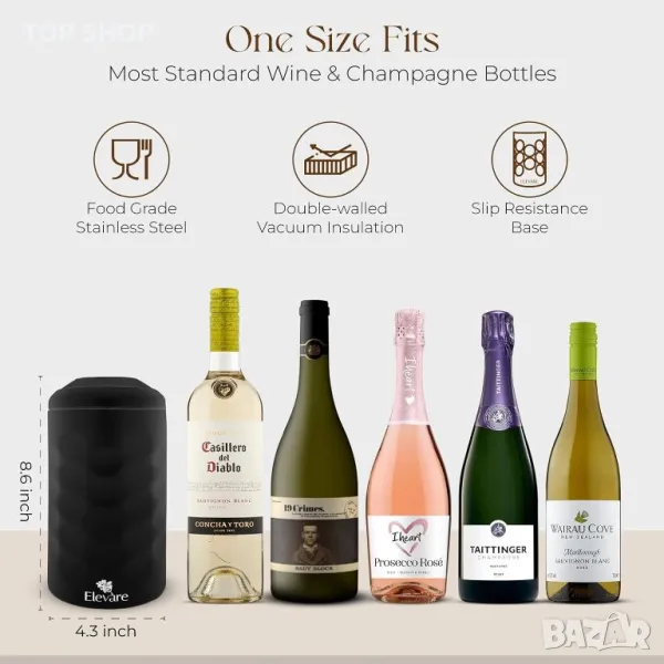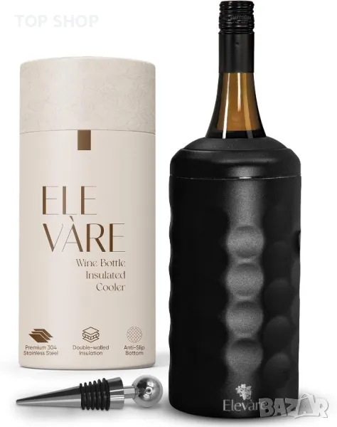 Охладител за вино Elevàre, революционно решение, изработено от висококачествена неръждаема стомана 304 с изолация с двойни стени, което гарантира, че вашето вино, просеко и шампанско остават охладени до 6 часа без неприятностите с лед или честите пътувания в хладилника. Универсалното му прилягане побира различни бутилки от 750 ml, докато елегантният му дизайн съчетава функционалност със стил, добавяйки изтънченост към всяка сервировка на масата. Лек и здрав, той е идеален за събития на открито, докато включената запушалка за вино от неръждаема стомана и шикозната опаковка в туба го правят идеален подарък за винени ентусиасти.