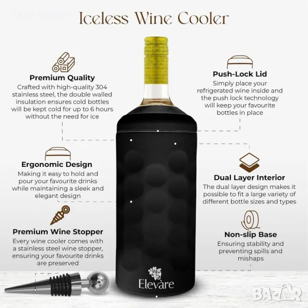 Охладител за вино Elevàre със запушалка | До 6-часово охлаждане | Двустенна неръждаема стомана,черен