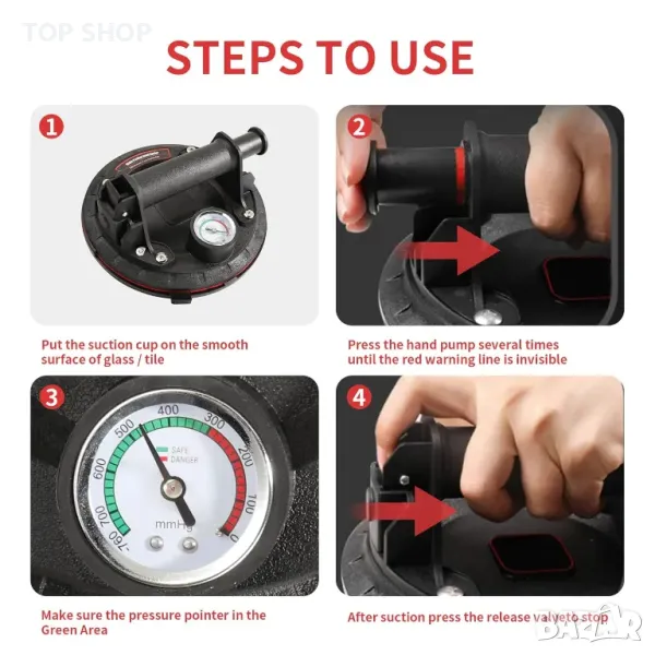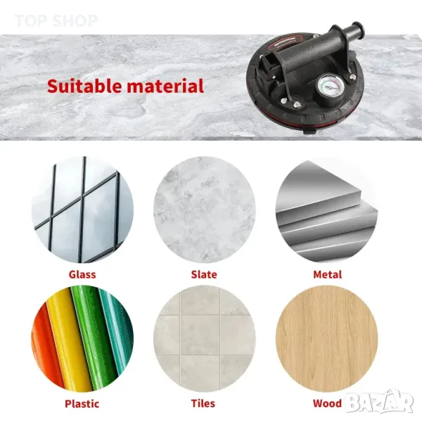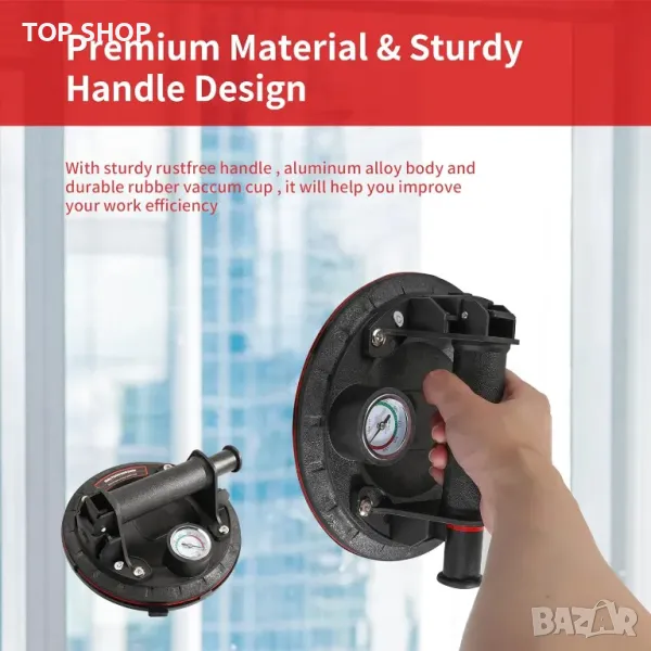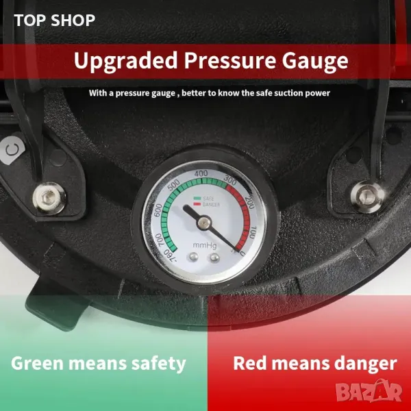 Тази вендуза за повдигане разполага с подобрен манометър за наблюдение на адсорбционното налягане, осигурявайки по-безопасна употреба чрез предотвратяване на падане на предмет. Той разполага с неплъзгаща се гумена вендуза и ергономична ABS пластмасова дръжка за комфорт. С висок капацитет на натоварване до 100 кг (220 lbs) вертикално, той е идеален за работа с тежки предмети като стъкло, плочки, огледала, ламарина и др. Идеален за различни гладки повърхности, включително предни стъкла на автомобили и дървени панели, повдигачът предлага гъвкавост. Не забравяйте да премахнете пластмасовия капак за прах и се уверете, че повдиганият материал е гладък и без прах за оптимална работа.