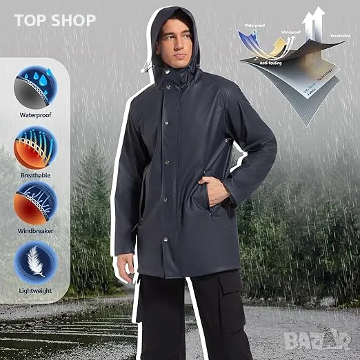 Този мъжки дъждобран е изработен от PET материал с PU покритие, включващ двуслойна технология за прилягане за леко, водоустойчиво изживяване. Качулката му е прецизно проектирана за защита на врата и за предпазване от студени ветрове, осигурявайки оптимална устойчивост на дъжд и топлина. Платът на якето за дъжд е подобрен с нова устойчива на износване технология на тъкане, което го прави издръжлив за интензивни планински спортове, като същевременно е устойчив на масло и петна, идеален за пътуване, спорт и приключения на открито. Ергономично ушито, якето предлага комфорт, без да ограничава движенията, подходящо за ежедневно носене и различни дейности на открито като планинарство и туризъм. Отличава се с практичен дизайн със скрити вътрешни джобове за лични вещи, а класическият му стил излъчва мъжествен чар, подходящ е и за ежедневно облекло. За грижа, нежно перете при 30°C, като избягвате избелване, сушене в сушилня, гладене и химическо чистене, за да запазите качеството си.