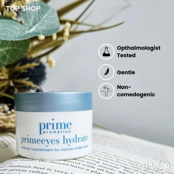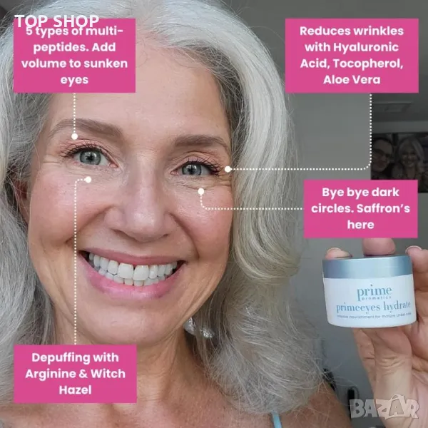 PrimeEyes Hydrate е вашата ежедневна терапия за очи, осигуряваща немазна, лесно абсорбираща се хидратация, която изпълва и хидратира деликатната кожа под очите. Създаден да се бори със сухотата, торбичките, подпухналостта, фините линии, бръчките и тъмните кръгове, той осигурява интензивен удар от овлажняване. Специално формулиран за зрели жени, той съчетава 5 пептида с хиалуронова киселина, сквален и масло от жожоба за стягане и ревитализиране. Този околоочен крем помага на вашия коректор да стои гладко, като ви придава свеж, млад и отпочинал вид. Просто потупвайте крема за незабавни и дълготрайни ползи.