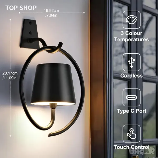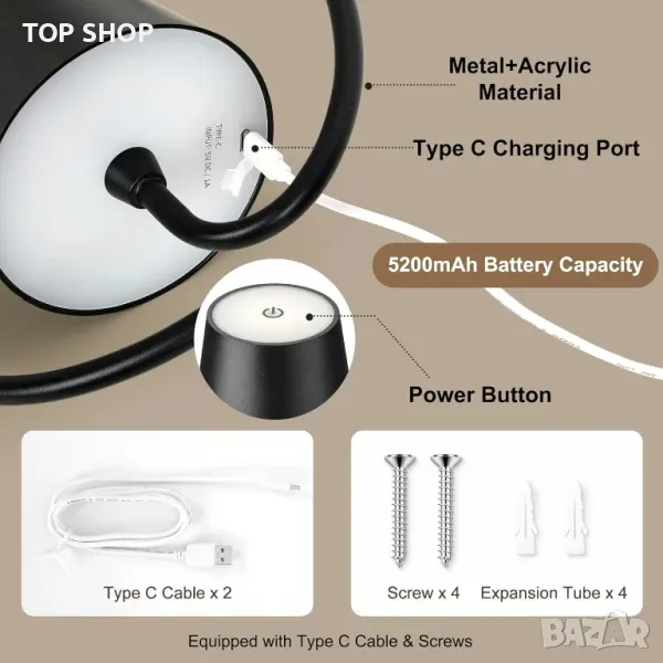 Този безжичен аплик за стена разполага с батерия от 5200 mAh с тип C зареждане, което прави инсталирането лесно без необходимост от окабеляване. Неговият преносим дизайн позволява гъвкава употреба в различни настройки, перфектен по време на прекъсване на захранването. Светлината предлага три регулируеми цветови температури (3000K-6000K) и затъмняване от 5% до 100%, персонализирано за различни среди. С IP54 водоустойчив рейтинг, той е подходящ както за вътрешна, така и за външна употреба. Разпределението на светлината от 360° предпазва очите с LED осветление без трептене и отблясъци, което гарантира безопасност и комфорт. Идеален за всекидневни, спални, бани и много други, това е универсален, обмислен подарък.