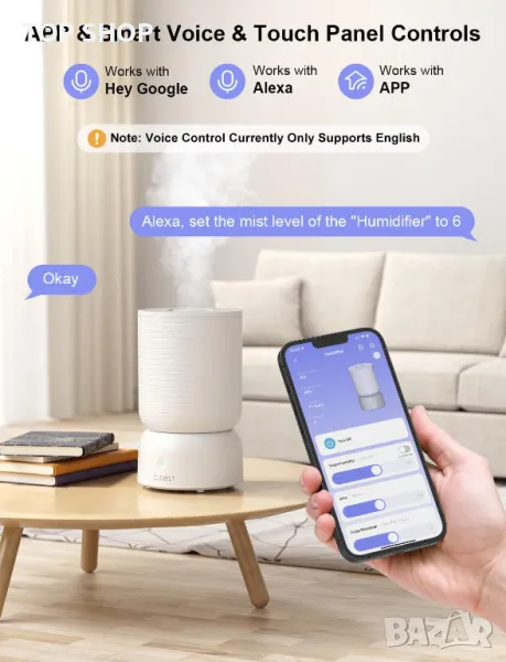 Интелигентен вътрешен овлажнител, управляван чрез CLEVAST APP за безпроблемен отдалечен достъп. Лесно превключвайте захранването, регулирайте нивата на влажност, интензитета на мъглата, задавайте таймери и графици, като същевременно запазвате предпочитаните от вас настройки. Съвместим с Alexa и Google Assistant за удобен гласов контрол, той работи в мрежа от 2,4 GHz. Отличаващ се с усъвършенствана ултразвукова технология за мъгла с ниво на шума ≤32dB, той е тих като шепот. С 3 литра резервоар за вода отгоре може да работи до 24 часа. Регулируемият на 360° накрайник осигурява широко покритие, допълнено от изящния минималистичен европейски дизайн, идеален за домашен декор. Освен това се насладете на допълнителното предимство на ароматната терапия с ароматни подложки, създаващи освежаваща атмосфера. Нашият овлажнител гарантира безопасност с напомняния за недостиг на вода и автоматично изключване. Отговаряйки на стандартите на FCC, CE и UKCA, той не съдържа BPA и е идеален за различни настройки, включително спални, детски стаи и офиси. Почистването е лесно с резервоар с голям отвор и подвижни компоненти. Кажете сбогом на неудобството с дизайн с горно пълнене и включена четка за почистване.
