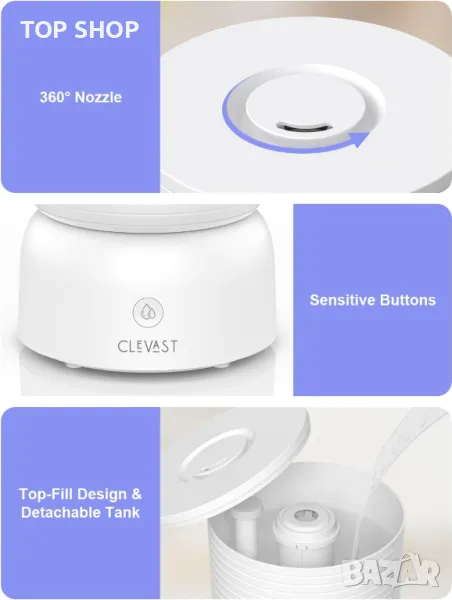Интелигентен овлажнител CLEVAST, с горно пълнене 3 л Cool Mist