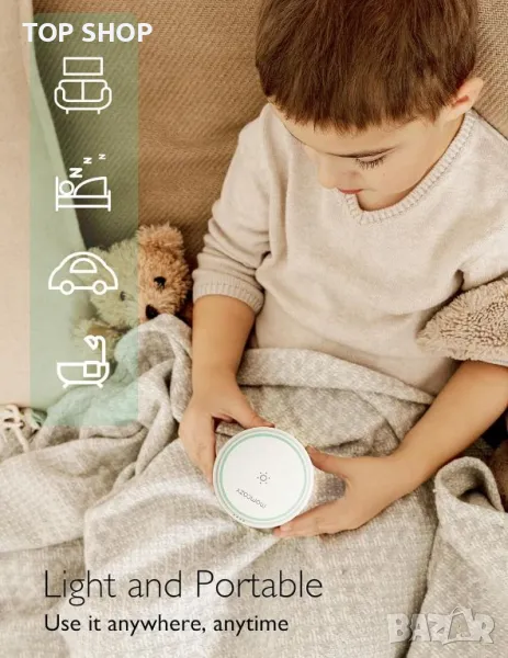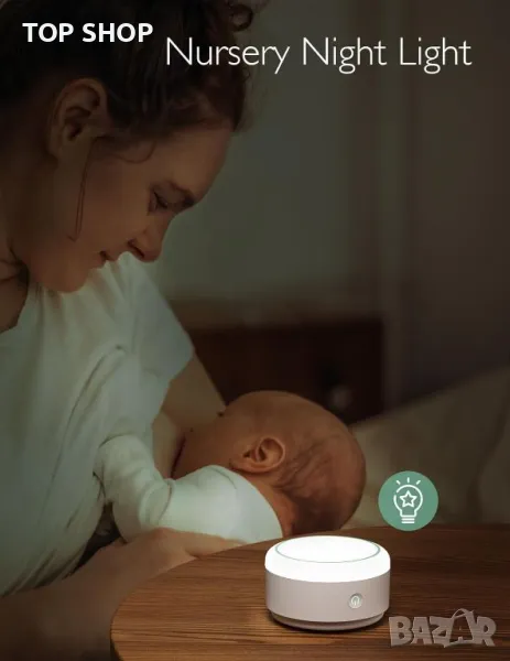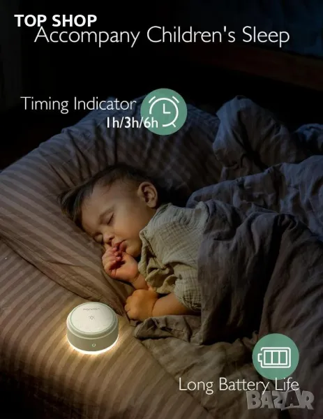 Тази универсална лампа разполага с чувствителен на допир главен превключвател, който служи и като източник на светлина, улеснявайки лесната работа на тъмно. Оборудван е с 20 успокояващи звука за сън, включително различни цветове на шума (бяло, розово, кафяво, зелено), звуци от вентилатори и звуци от природата, като океански вълни, дъжд и други, насърчавайки спокойна среда за сън. Лампата също предлага регулируеми настройки на яркостта, опции за таймер 1h/3h/6h и функция за памет, която извиква последните използвани настройки за звук и сила на звука. Идеален за нощна употреба, той осигурява нежна светлина, идеална за посещения в банята или проверка на бебето. Преносим и акумулаторен, той се зарежда напълно за 2,5 часа и е чудесен за пътуване, осигурявайки спокойна атмосфера, където и да отидете.