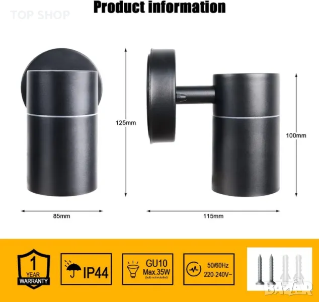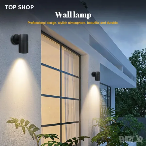 Осветете вашето пространство с елегантност и стил с нашата модерна стенна лампа с двойна светлина. Със стандартна основа GU10 и високотехнологичен дизайн на процеса на боядисване, тази стенна лампа е перфектна комбинация от функционалност и съвременна естетика. Стенната лампа се предлага със стандартна основа GU10, която ви предлага свободата да инсталирате LED крушки, халогенни или всякакви крушки GU10 според вашите предпочитания. (Моля, обърнете внимание: Крушките не са включени. Еквивалентната мощност не трябва да надвишава 35 W, с номинално напрежение 220-240 V ~). С високотехнологичен дизайн на процеса на боядисване, тази стенна лампа демонстрира модерен и семпъл вид, който допълва всеки декор. Тялото на лампата се поддържа от здрав лят алуминий, осигуряващ стабилност и първокласно качество. Оценен като водоустойчив IP44, тази стенна лампа е подходяща за употреба на открито. IP44 обаче не предполага продължително потапяне под вода или излагане на дъжд, което може да повлияе на живота на продукта. За да осигурите дълготрайност, препоръчително е да покриете лампата с кърпа при продължителен дъжд. Модерният дизайн се отличава с уникално сияние нагоре и надолу, добавяйки атмосферно и семпло докосване към вашето пространство. Тази красива и удобна стенна лампа е идеална за вътрешни дворове, градини, веранди, врати, гаражи и др.