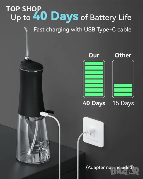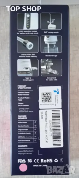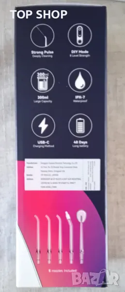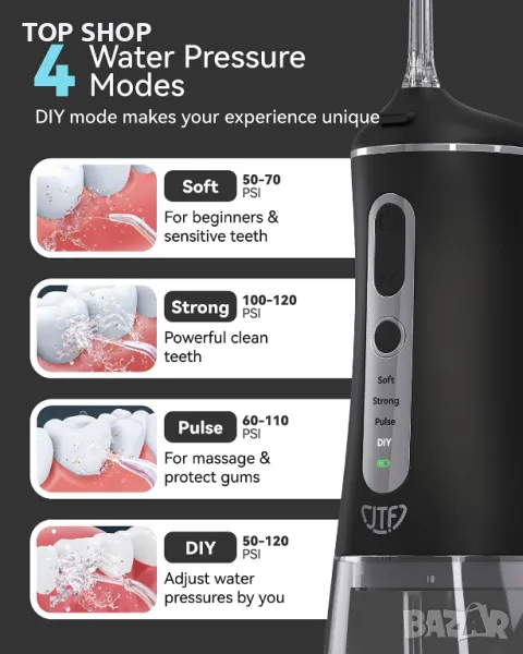 JTF F100 Water Flosser се предлага с разширени функции, предназначени за оптимална орална хигиена. Той може да се похвали с 0,6 mm ултра фин воден стълб и доставя до 1800 импулса в минута с водно налягане, вариращо от 50-120 PSI, като ефективно премахва 99,9% от зъбния камък и остатъците от храна, осигурявайки свеж дъх и по-здрави венци. С четири режима на почистване (Мек, Силен, Импулсен и Направи си сам) плюс функция за интелигентна памет, той се грижи за индивидуалната чувствителност и предпочитания, като запомня последната Ви настройка за удобство. Устройството включва голям 300 ml подвижен резервоар за вода, което намалява необходимостта от презареждане и опростява поддръжката. Неговият 360° дизайн на гравитационна топка осигурява ефективна работа под всякакъв ъгъл, допълнен от IPX7 водоустойчив рейтинг за безопасно използване на душ. Конецът е USB акумулаторен, с 1500mA батерия, която се зарежда за по-малко от 6 часа и издържа до 40 дни, придружен от USB Type-C кабел. Пакетът е пълен с 3 стандартни струйни накрайника, ортодонтски накрайник, скрепер за език и ръководство за потребителя, което го прави идеален подарък за насърчаване на уверени и здрави усмивки.
