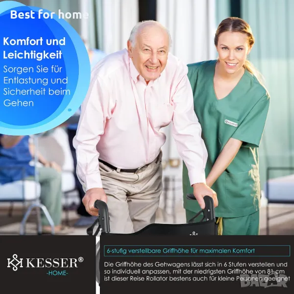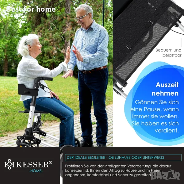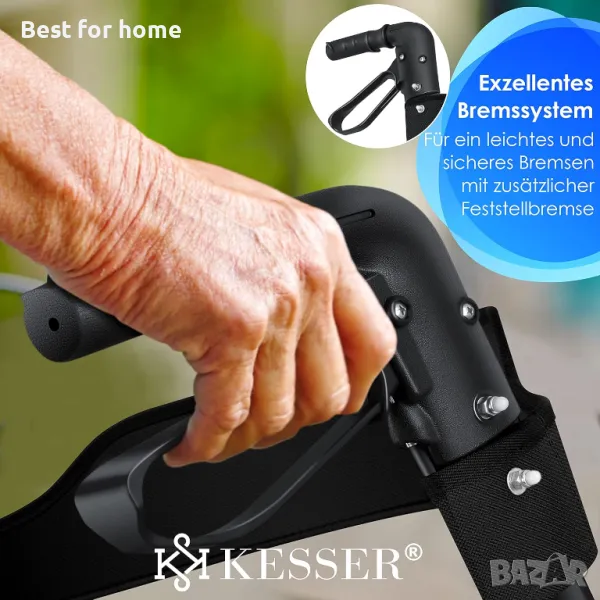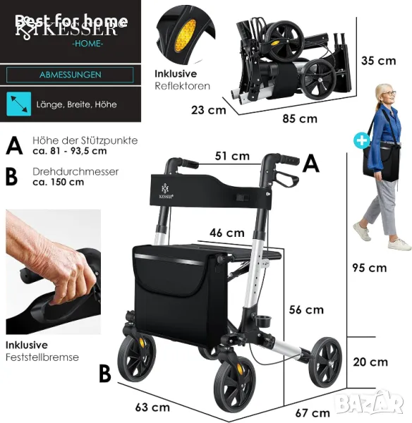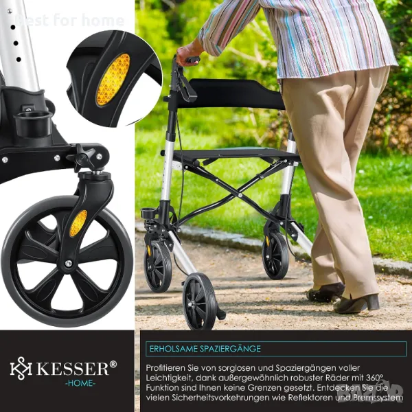 Ролаторът KESSER, без компоненти с остри ръбове, впечатлява със своята компактна технология за двойно сгъване, широка седалка и облегалка, вкл. рефлектори и плътни гуми.