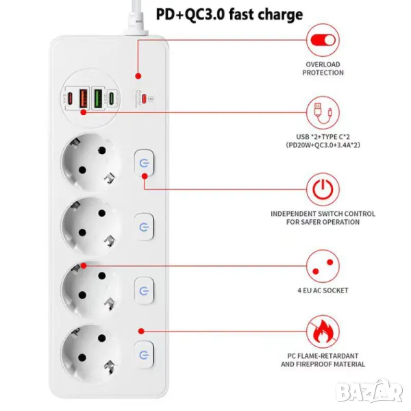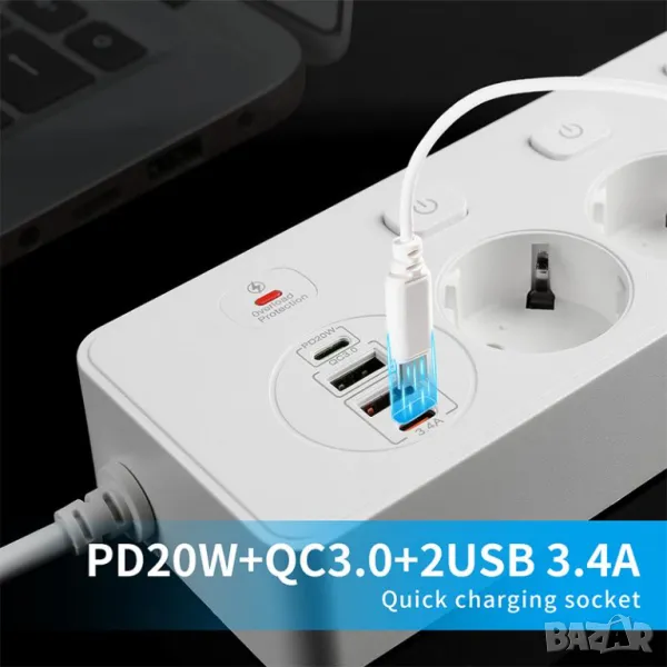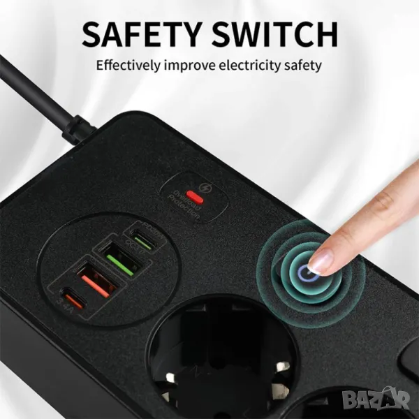 Разклонителят с четири гнезда, 2 USB порта и 2 USB-C порта е идеалното решение за вашия офис, работилница или дом.