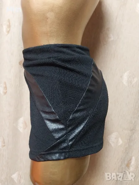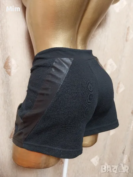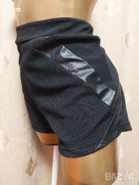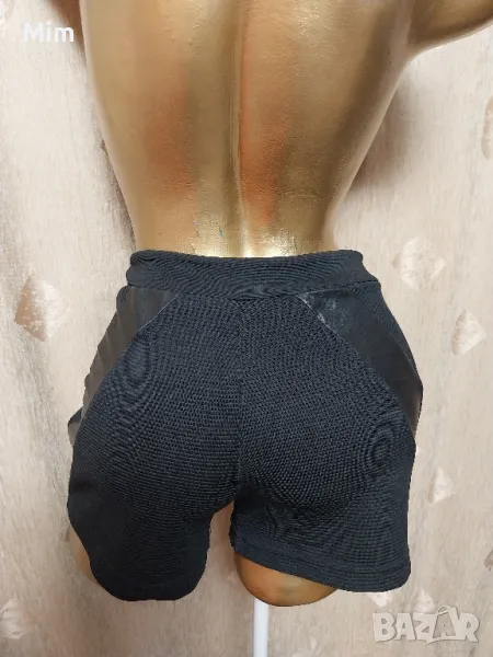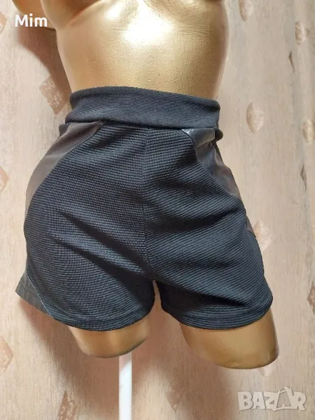 Черни къси панталонки от релефна еластична материя странично с украсителни фигури от еко кожа закопчаването е странично с цип, талия 42 до 47 см едностранно, ханш 50 со 55 см едностранно, дължина 30 см ,широчина на крачола 31 до 36 см едностранно. Няма забележки.