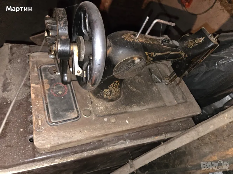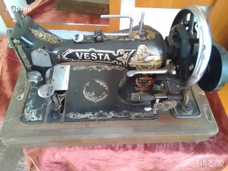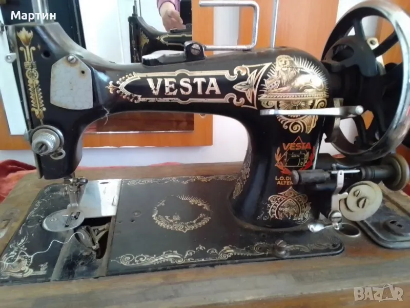 Ръчна шевна машина Vesta. В добро състояние. Поставката е дървена и на места е изгнила.