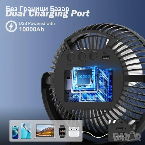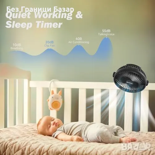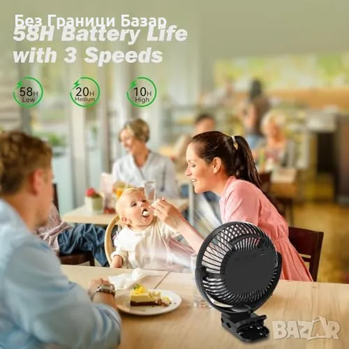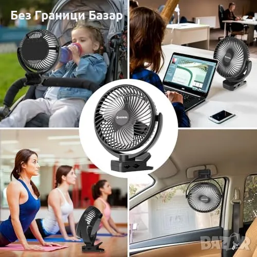 Нов Преносим вентилатор за количка – акумулаторен, въртящ се, 3 скорости